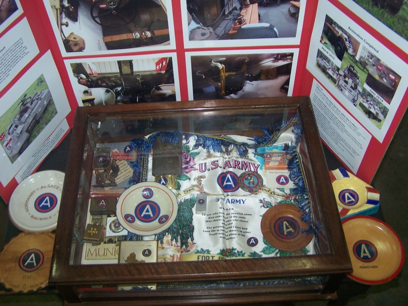 In order to reproduce Patton’s M20 Armored Utility car, Patton’s Third Army Living Historians decided to do photo-shop comparisons to make sure the flags, horn and rank plate was the proper size. When we were almost finished and in order to get it right, we took our M-20, Patton’s and his original M-20 and then put Patton inside of ours. It all had to match in size and scale to be correct.